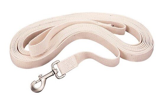 Płaska, bawełniana lonża zakończona wytrzymałym, niklowanym karabińczykiem.