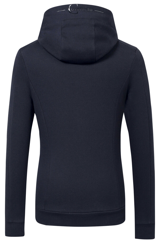 Damska bluza z kapturem z wyjątkowo przyjemnego i miękkiego materiału z polarową wewnętrzną stroną, dwukierunkowym zamkiem błyskawicznym z nadrukowanym logo Covalliero, który po rozpięciu i zapięciu tworzy ciekawy efekt, oraz 2 bocznymi kieszeniami zapinanymi na zamek.
