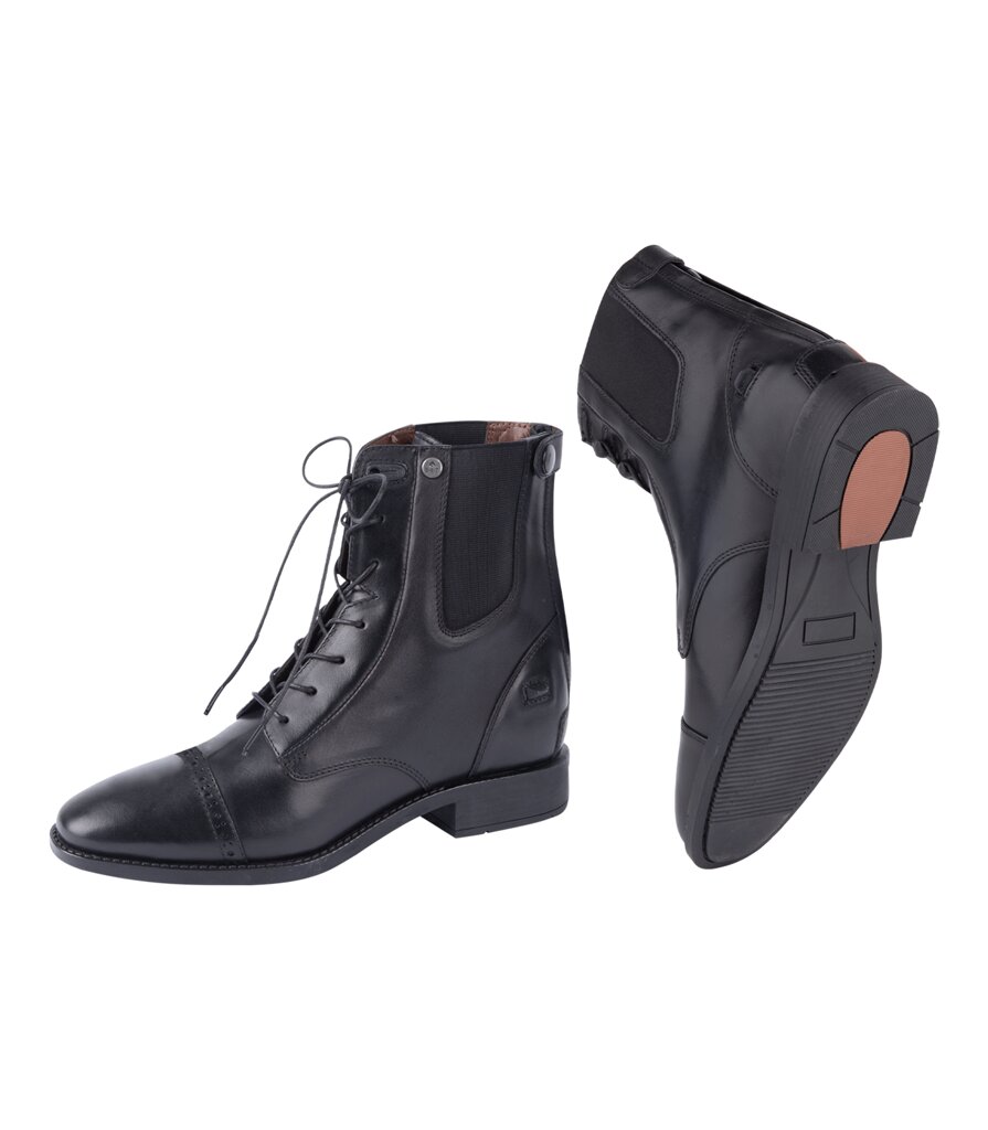 Buty wykonane są z gładkiej skóry, która jest nie tylko wytrzymała, ale również wodoodporna. Zamek błyskawiczny z tyłu ułatwia zakładanie, a sznurowanie zapewnia idealne dopasowanie do stopy. Elastyczne wstawki po bokach zwiększają komfort chodzenia i jazdy konnej.