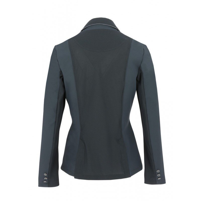 Damska marynarka konkursowa EQUITHEME Olivia wykonana jest z wodoodpornego, oddychającego i elastycznego materiału. Marynarka jest bardzo przewiewna dzięki perforowanemu, siateczkowemu materiałowi na plecach i rękawach. Dzięki temu jest bardzo wygodna i umożliwia jeźdźcowi nieograniczony ruch. Marynarka zapinana jest na guziki, po bokach znajdują się kieszenie, które – podobnie jak kołnierz – ozdobione są subtelną lamówką z cekinów.• marynarka konkursowa