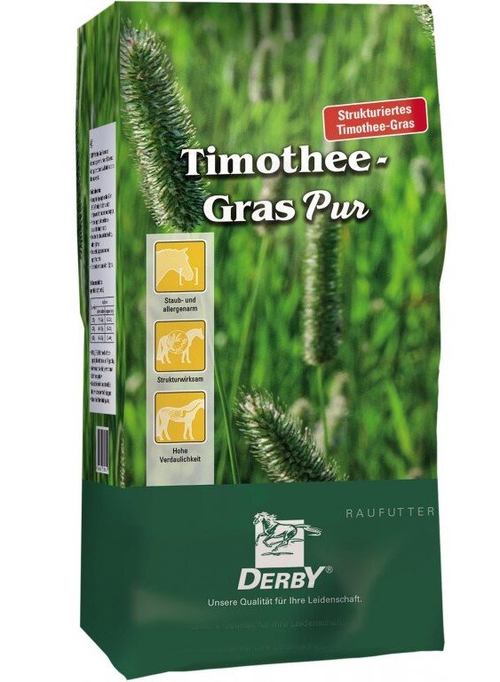 Wysokiej jakości roślina trawiasta – tymotka łąkowa, która znajduje się w DERBY® Timothee-Gras Pur, ma obniżoną zawartość białka i jest dzięki temu odpowiednia do żywienia koni z chorobami metabolicznymi, takimi jak Cushing, ochwat, EMS i PSSM. Dzięki olejowi słonecznikowemu dodanemu do trawy może być również bezpiecznie podawana koniom uczulonym na kurz. Przy delikatnym procesie suszenia witaminy, minerały i pierwiastki śladowe zostały zachowane. Ta pasza objętościowa może być łatwo porcjowana.