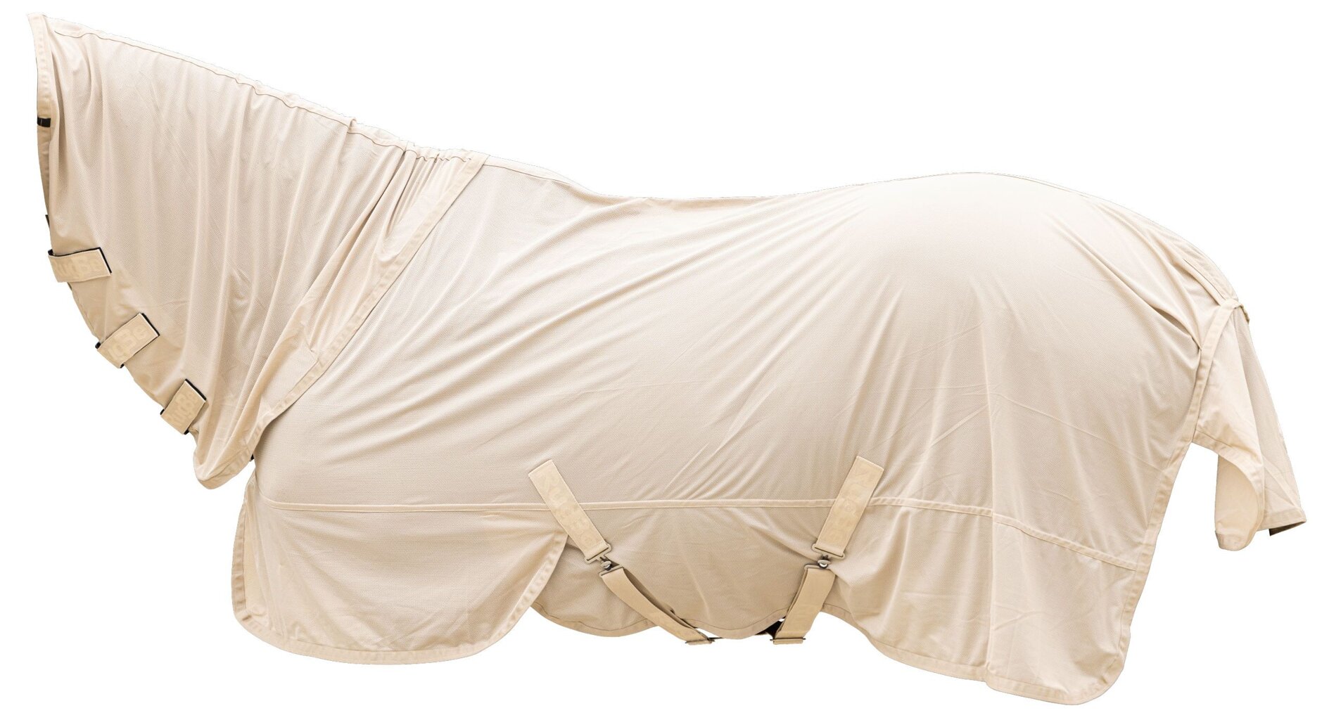 Lekka siatkowa derka przeciw owadom wykonana z miękkiego materiału poliestrowego z zapięciem na klamrę i rzep na klatce piersiowej, odpinaną szyją, regulowanym zapięciem krzyżowym pod brzuchem i ochraniaczem na ogon.