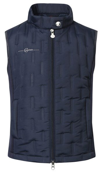 Lekka, sportowa, kombinowana dziecięca kamizelka z elastycznego materiału po bokach i pikowanego poliestru. Kamizelka ma stójkowy kołnierz z paskiem na nap, dwukierunkowy zamek błyskawiczny oraz haft Covalliero po prawej stronie.