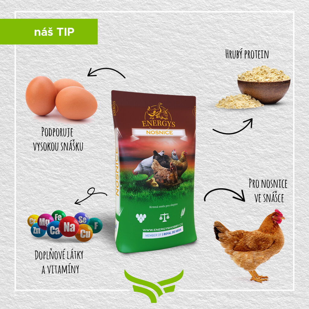 Granulované krmivo pro nosnice ve snášce. Podpora vysoké snášky vajec s pevnou skořápkou a krásnou barvou žloutku.
