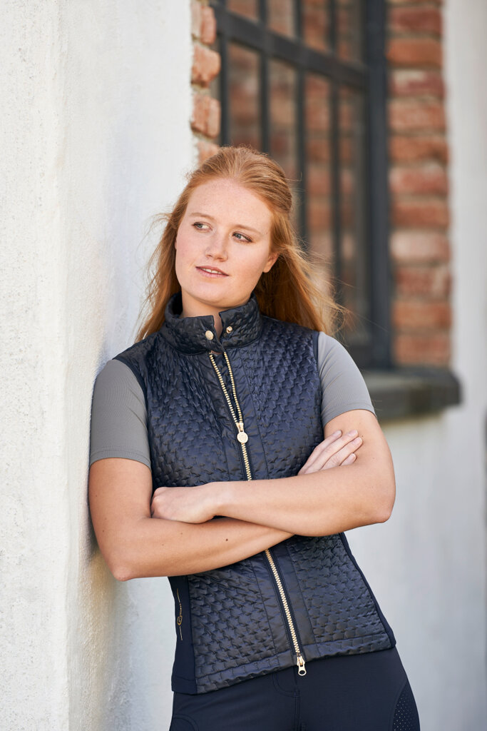 Damska kamizelka sportowa z kolekcji Covalliero jest właśnie dla Ciebie, jeśli cenisz sobie funkcjonalność i swobodę ruchów. W okolicy bioder znajduje się elastyczny materiał, który pięknie przylega do ciała, a korpus kamizelki wykonany jest z elastycznego pikowanego materiału bez szwów. Dwie ukryte boczne kieszenie zapinane na zamek utrzymają Twoje cenne przedmioty w bezpiecznym miejscu, nie ryzykując ich wypadnięcia. Kamizelka świetnie sprawdzi się zarówno podczas jazdy konnej, jak i w czasie wolnym.