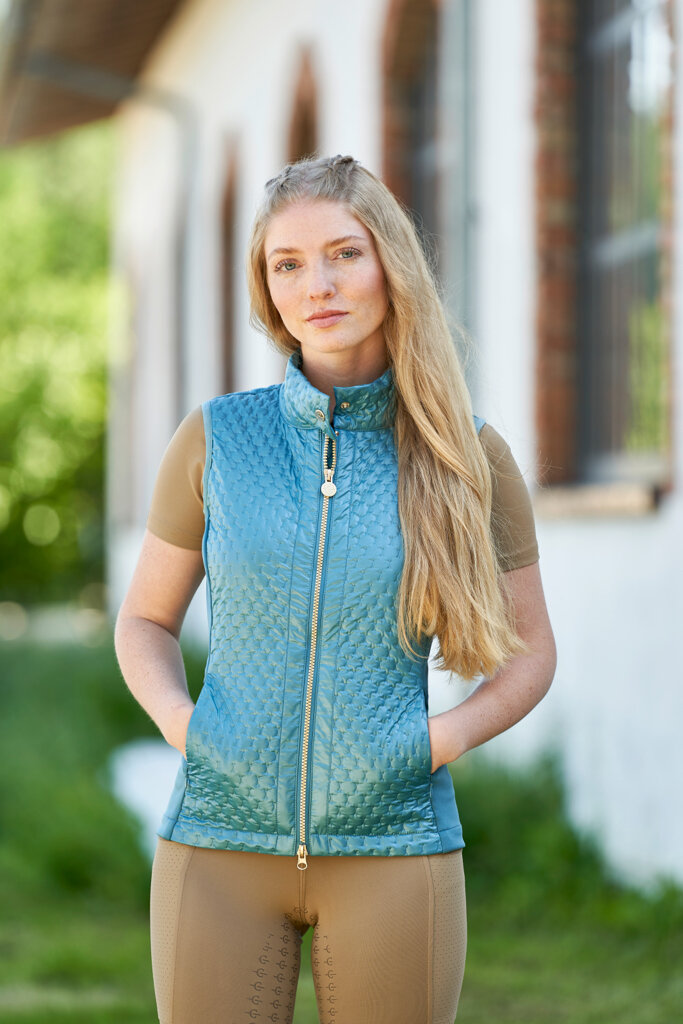 Damska kamizelka sportowa z kolekcji Covalliero jest właśnie dla Ciebie, jeśli cenisz sobie funkcjonalność i swobodę ruchów. W okolicy bioder znajduje się elastyczny materiał, który pięknie przylega do ciała, a korpus kamizelki wykonany jest z elastycznego pikowanego materiału bez szwów. Dwie ukryte boczne kieszenie zapinane na zamek utrzymają Twoje cenne przedmioty w bezpiecznym miejscu, nie ryzykując ich wypadnięcia. Kamizelka świetnie sprawdzi się zarówno podczas jazdy konnej, jak i w czasie wolnym.