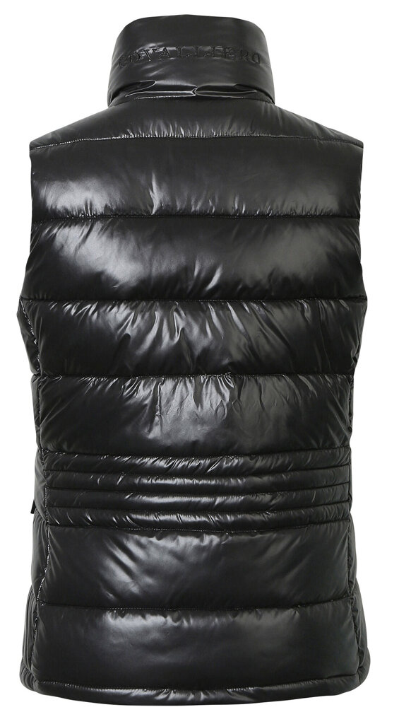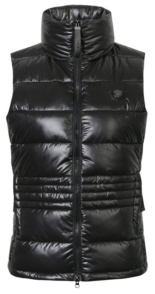 Damska pikowana kamizelka z delikatnie połyskującego materiału, z wysokim kołnierzem, dopasowanym krojem, dwukierunkowym zamkiem błyskawicznym i 2 kieszeniami zapinanymi na zamek.
