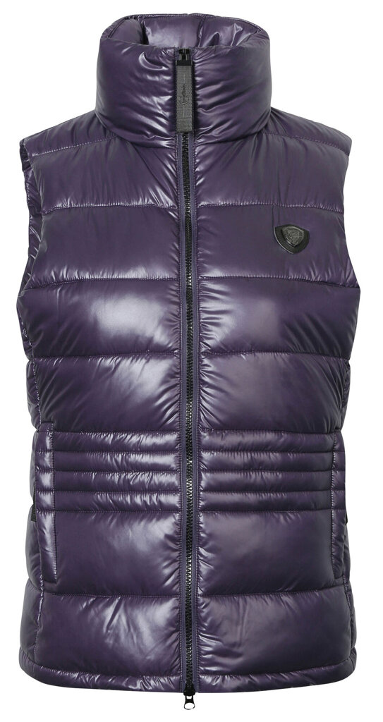 Damska pikowana kamizelka z delikatnie połyskującego materiału, z wysokim kołnierzem, dopasowanym krojem, dwukierunkowym zamkiem błyskawicznym i 2 kieszeniami zapinanymi na zamek.