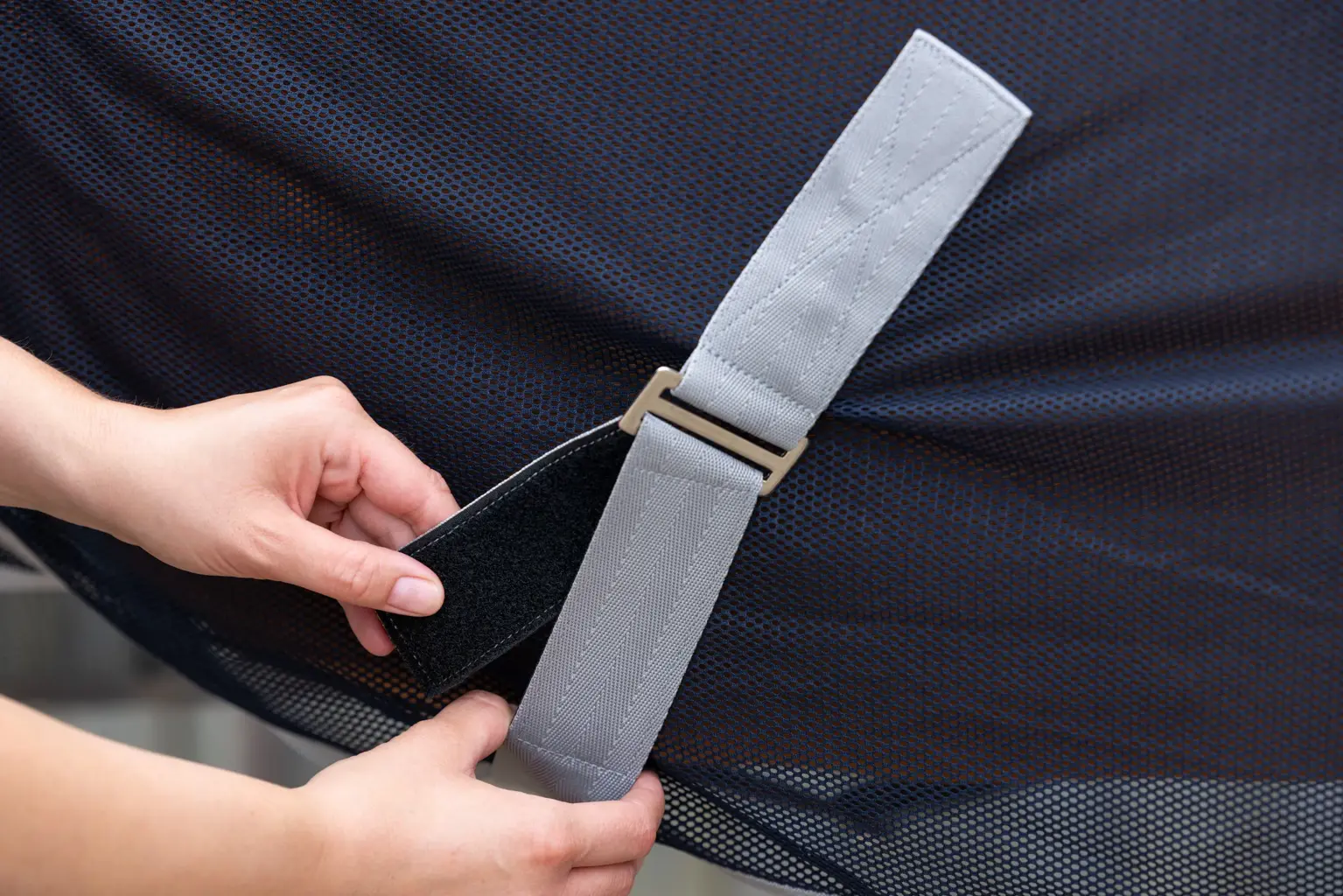 Wyrafinowany krój zapewnia bezpieczne i stabilne dopasowanie do ciała konia. Odpinane paski poprzeczne i regulowane zapięcie na rzepy umożliwiają indywidualne dopasowanie i niezawodne trzymanie nawet podczas ruchu lub transportu.