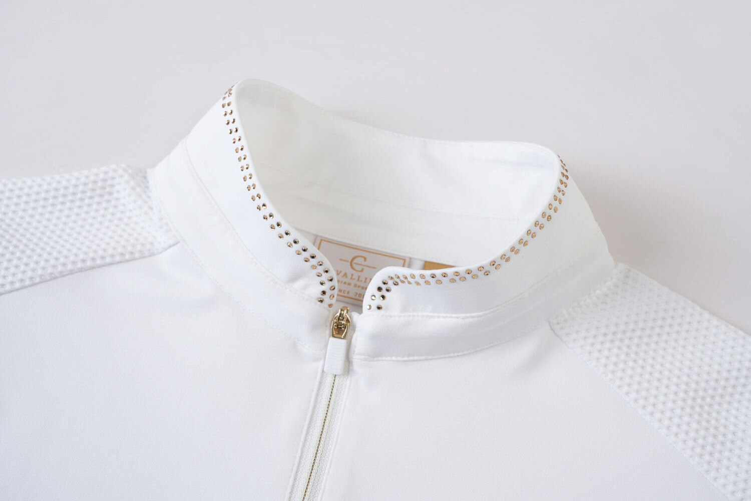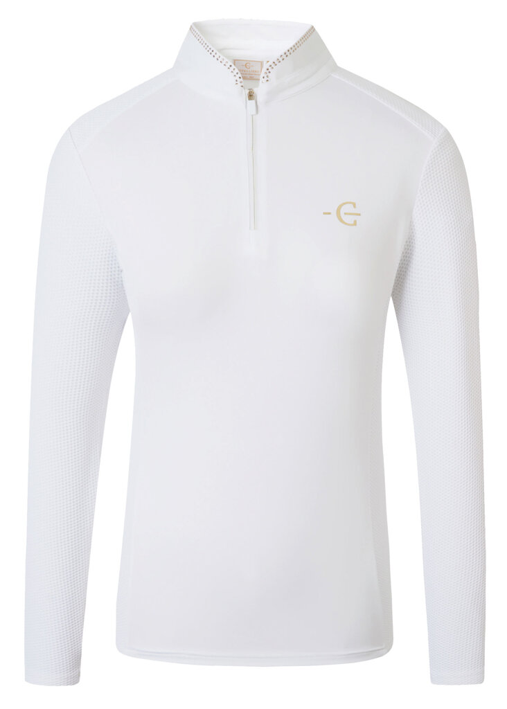 Koszulka ma dopasowany, kobiecy krój, który idealnie dopasowuje się do ciała, zapewniając jednocześnie maksymalną swobodę ruchów w siodle. Elegancka stójka z zamkiem błyskawicznym ułatwia zakładanie, a subtelna brokatowa aplikacja na kołnierzu nadaje modelowi stylowy, wyścigowy wygląd.