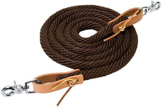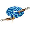 Miękkie linowe wodze z zakończeniami ze skóry i niklowanymi karabińczykami.