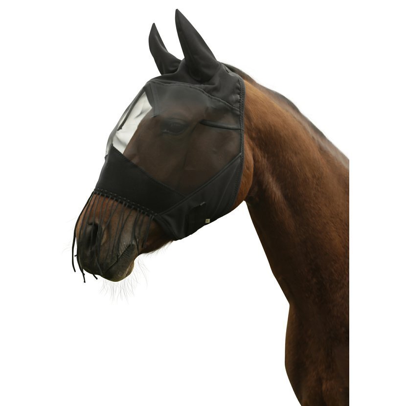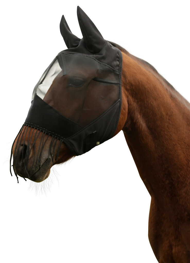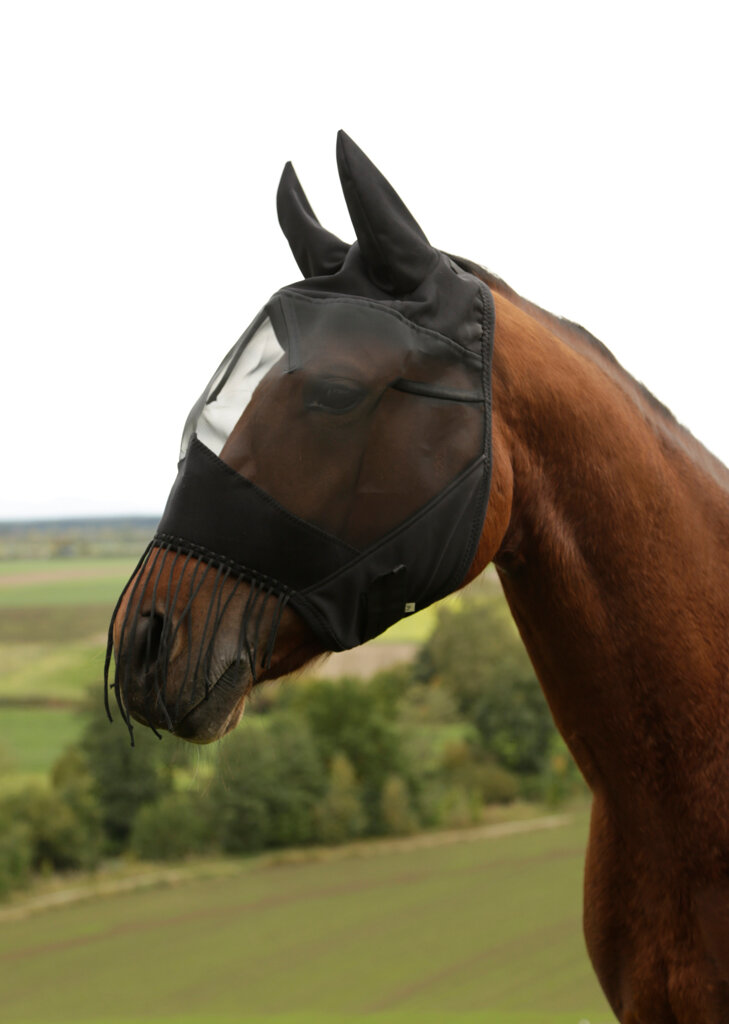 Maska przeciw muchom z osłoną uszu i sznurkową osłoną nozdrzy.• z frędzlami do odpędzania much i innych owadów z wrażliwej okolicy nozdrzy
