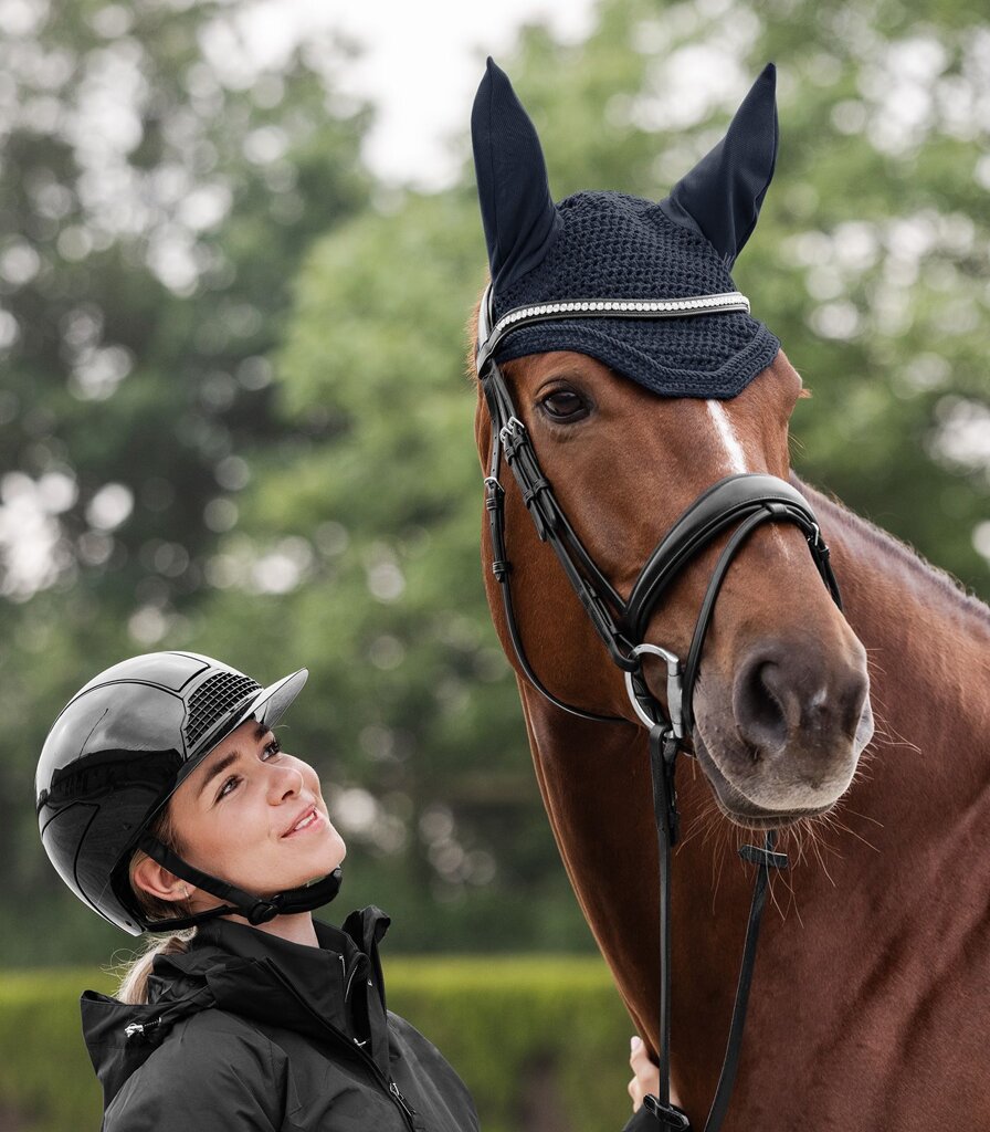 Nauszniki W Basic z szydełkowanym przodem Stylowy czaprak, który zapewnia koniowi wysoki komfort dzięki miękkiemu i elastycznemu materiałowi poliestrowemu. Idealnie dopasowuje się do ciała i jest wygodny nawet przy długotrwałym noszeniu. Szydełkowana część przednia uzupełniona jest ozdobnym sznurkiem w pasującym kolorze, który dodaje elegancji. Uszy wykonane są z wysoce oddychającej siateczki, która zapewnia optymalną wentylację i komfort noszenia.