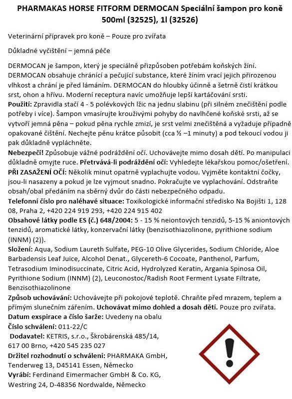 PHARMAKAS Horse fitform DERMOCAN Specjalny szampon dla koni• przenika głęboko do sierści, usuwa zanieczyszczenia i pot, regeneruje sierść i skórę