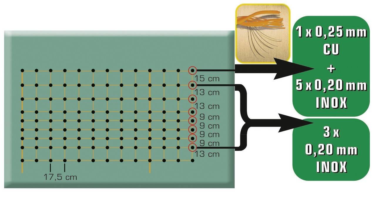 Optymalne prowadzenie energii elektrycznej do najdalszej siatki dla owiec dzięki cynkowanemu miedzianemu przewodowi w najwyższym linku! 20 razy wyższa przewodność w porównaniu do standardowych siatek!