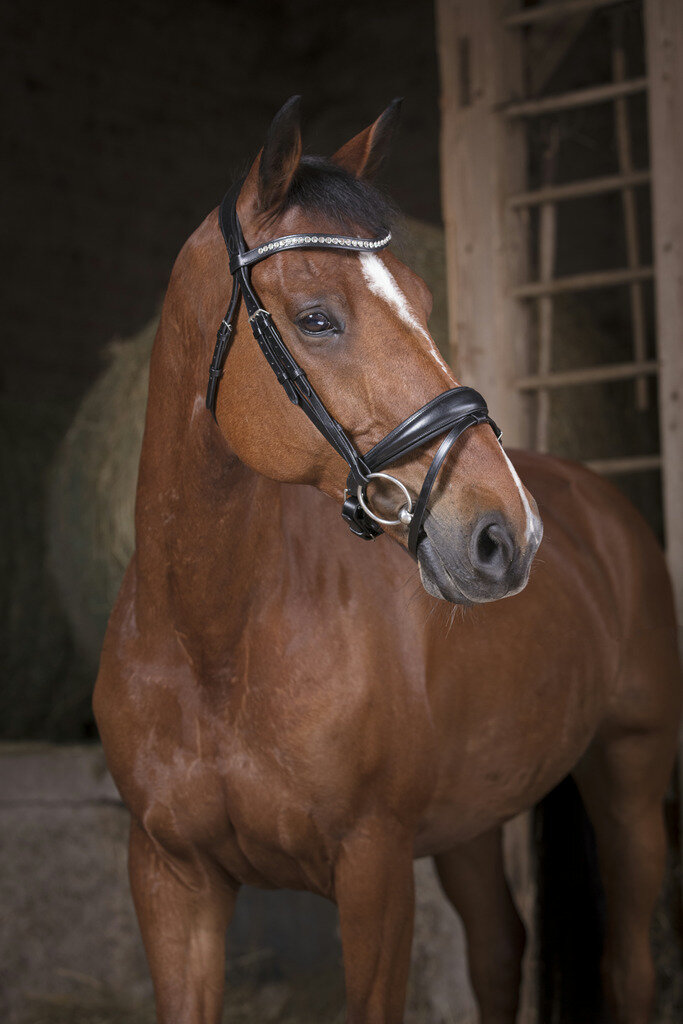 Uzda NORTON PRO Strass z anatomicznie ukształtowanym naczółkiem, paskiem potylicznym i szerszym szwedzkim nachrapnikiem. Wszystko miękko podszyte i wyściełane skórą bydlęcą, okucia ze stali nierdzewnej. Opaska jest ozdobiona dżetami. Łatwe mocowanie wędzarki za pomocą haczyków na uchu kołnierza. Uzda dostarcza się bez wodzy.• uzda z anatomicznie ukształtowanym naczółkiem
