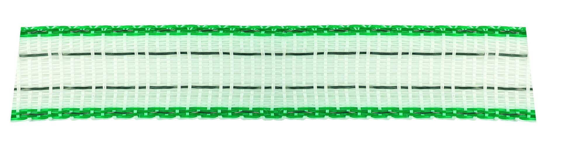 Wzmocnione zewnętrzne krawędzie – mocne włókna PE zabezpieczają bardzo wysoką wytrzymałość na rozciąganie.Taśmę należy zawsze łączyć płaskimi metalowymi złączami, ponieważ duża liczba węzłów ogranicza skuteczność ogrodzenia.
