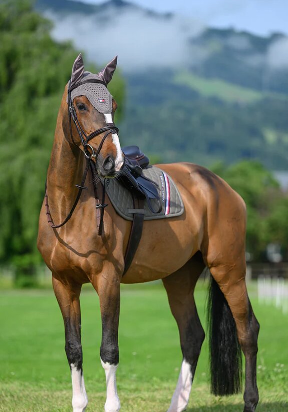 Stylowy czaprak skokowy TOMMY HILFIGER Stanford w nowoczesnym odcieniu popielatej szarości oferuje idealne połączenie komfortu, funkcjonalności i ekskluzywnego designu. Dzięki wysokiej jakości wykonania i przemyślanym detalom idealnie dopasowuje się do grzbietu konia i nadaje się do codziennego treningu i zawodów.
