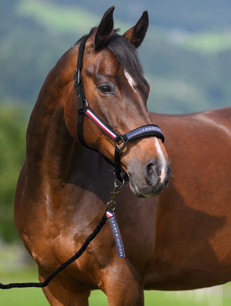 Stylowy i praktyczny komplet kantar i smycz TOMMY HILFIGER Yale w eleganckiej czerni łączy w sobie funkcjonalność, trwałość i kultowy design marki. Dzięki charakterystycznym detalom, takim jak logo i elementy Global Stripe, wygląda nowocześnie i reprezentacyjnie podczas codziennej pracy z końmi.