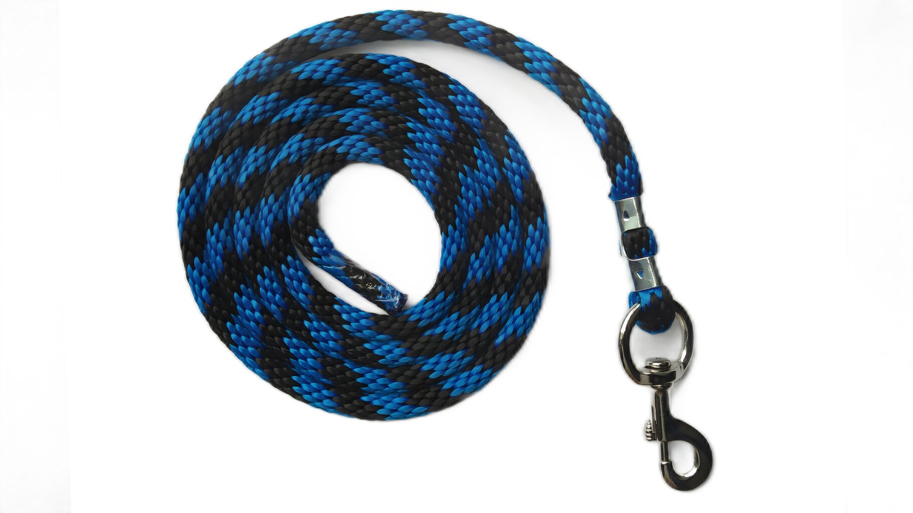 Bardzo przyjemny okrągły uwiąz z poprzecznie plecionej liny z mocnym, niklowanym karabińczykiem.