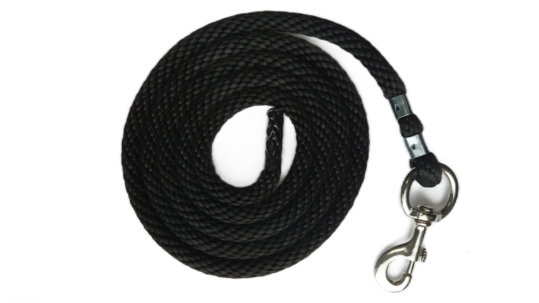 Bardzo przyjemny okrągły uwiąz z poprzecznie plecionej liny z mocnym, niklowanym karabińczykiem.
