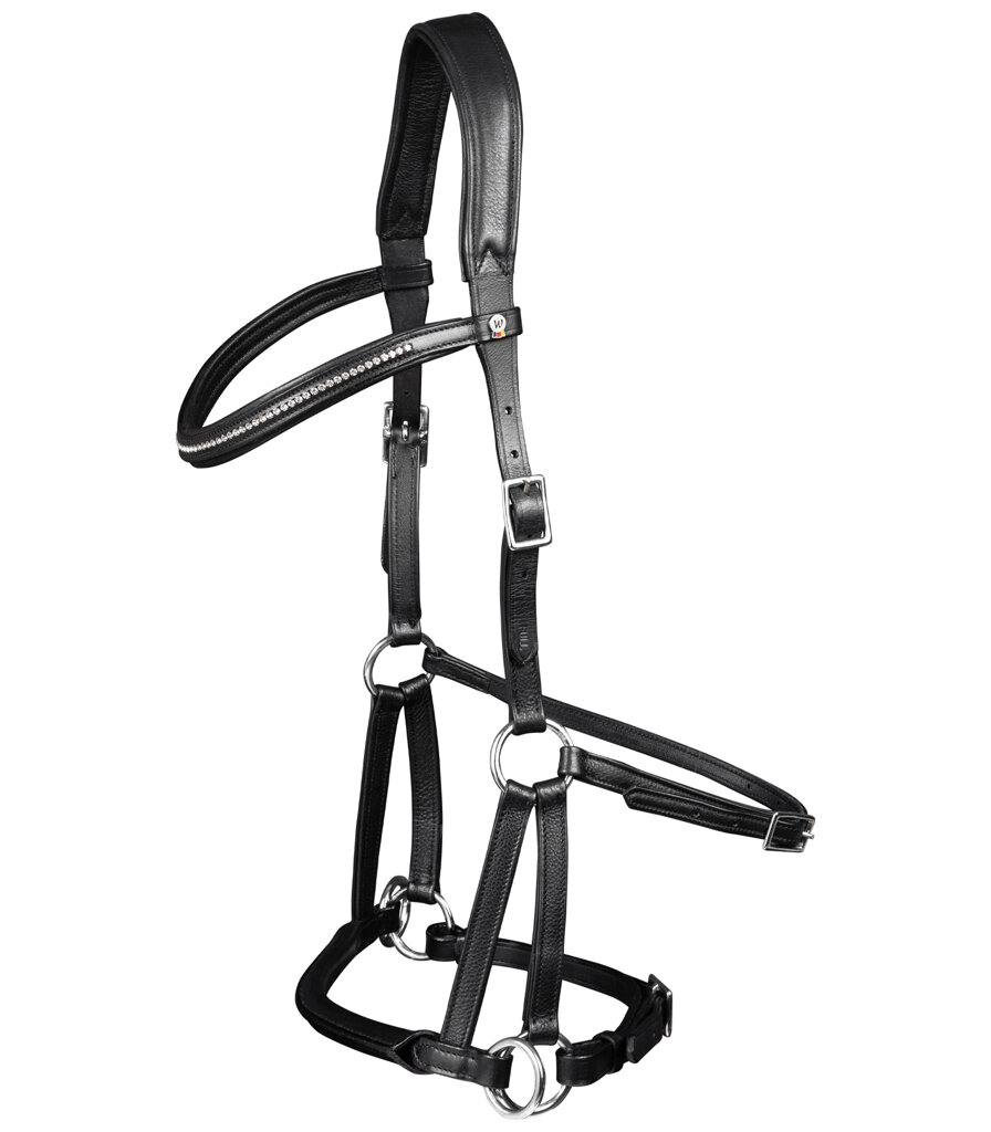 Anatomicznie ukształtowana, bezwędzidłowa uzda z miękko podszytym nachrapnikiem, potylicą i naczółkiem. Do uzdy użyto najwyższej jakości skóry. Naczółek jest ozdobiony kamieniami, okucia uzdy są ze stali nierdzewnej. Uzda jest dostarczana włącznie z wodzami.• anatomicznie ukształtowana