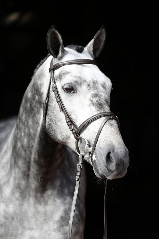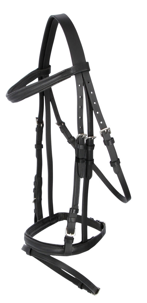 Klasyczna uzda angielska z kombinowanym nachrapnikiem, miękko podszytym naczółkiem, paskiem potylicznym i nachrapnikiem. Dostarczana w komplecie z parcianymi wodzami z przystawkami.
