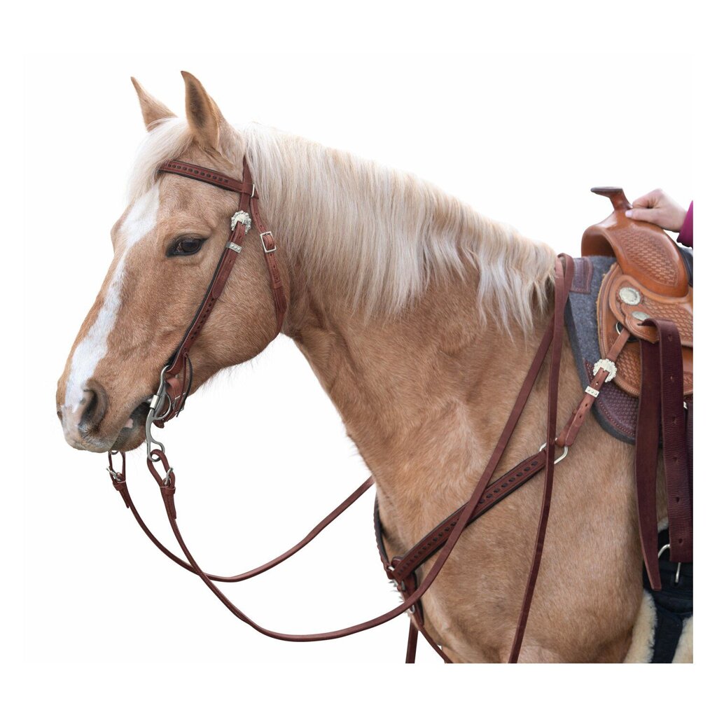 Solidna, ale wygodna uzda westernowa z miękko wyściełanym naczółkiem, gryzakiem i policzkami. Nakrycie głowy i kołnierz są ozdobione przeplataną skórą.