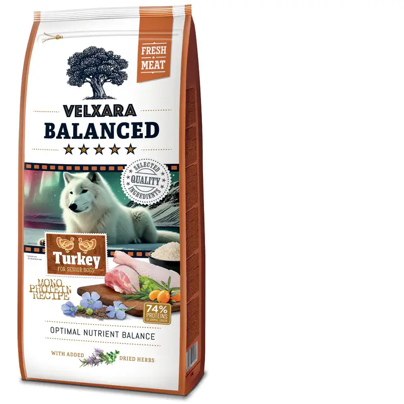 Karma dla psów Velxara Balanced jest monoproteinowa, co oznacza, że każda receptura zawiera tylko 1 źródło białka zwierzęcego (1 rodzaj mięsa). Receptura oznaczona jako „Indyk” zawiera świeże i suszone mięso z indyka. Etykieta „Senior Dogs” oznacza, że karma bezglutenowa jest przeznaczona dla starszych psów.