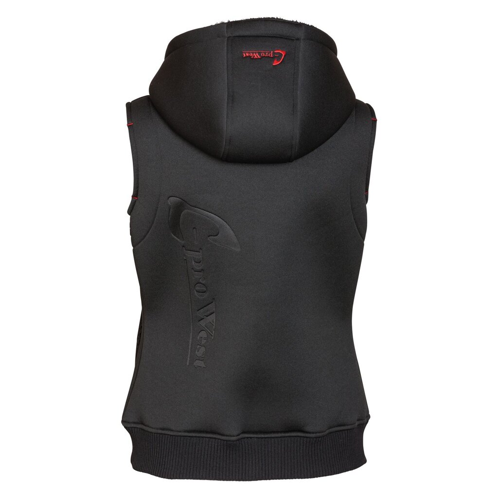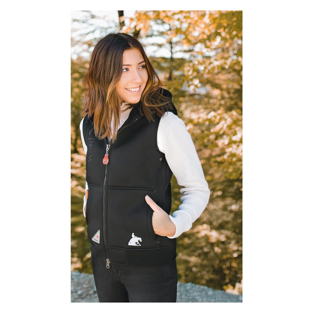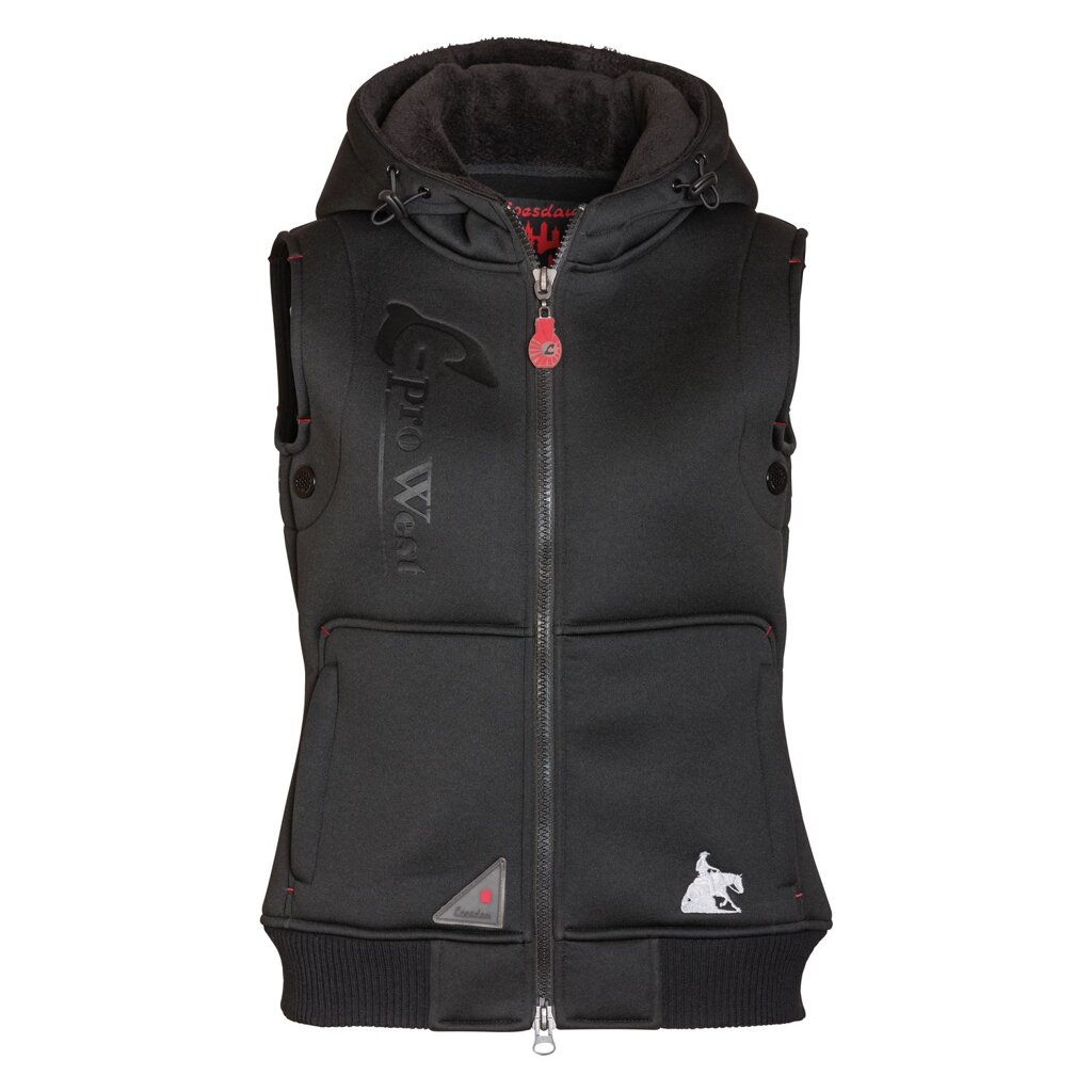 Odporna neoprenowa kamizelka jeździecka i rekreacyjna L-pro West z funkcjonalnymi detalami, takimi jak dwukierunkowy zamek, ocieplany kaptur z polarem typu teddy i możliwością ściągnięcia, ściągacze z dzianiny, 2 kieszenie zapinane na zamek. Całość dopełnia wypukły nadruk termiczny na prawej stronie i z tyłu kamizelki.• odporna kamizelka