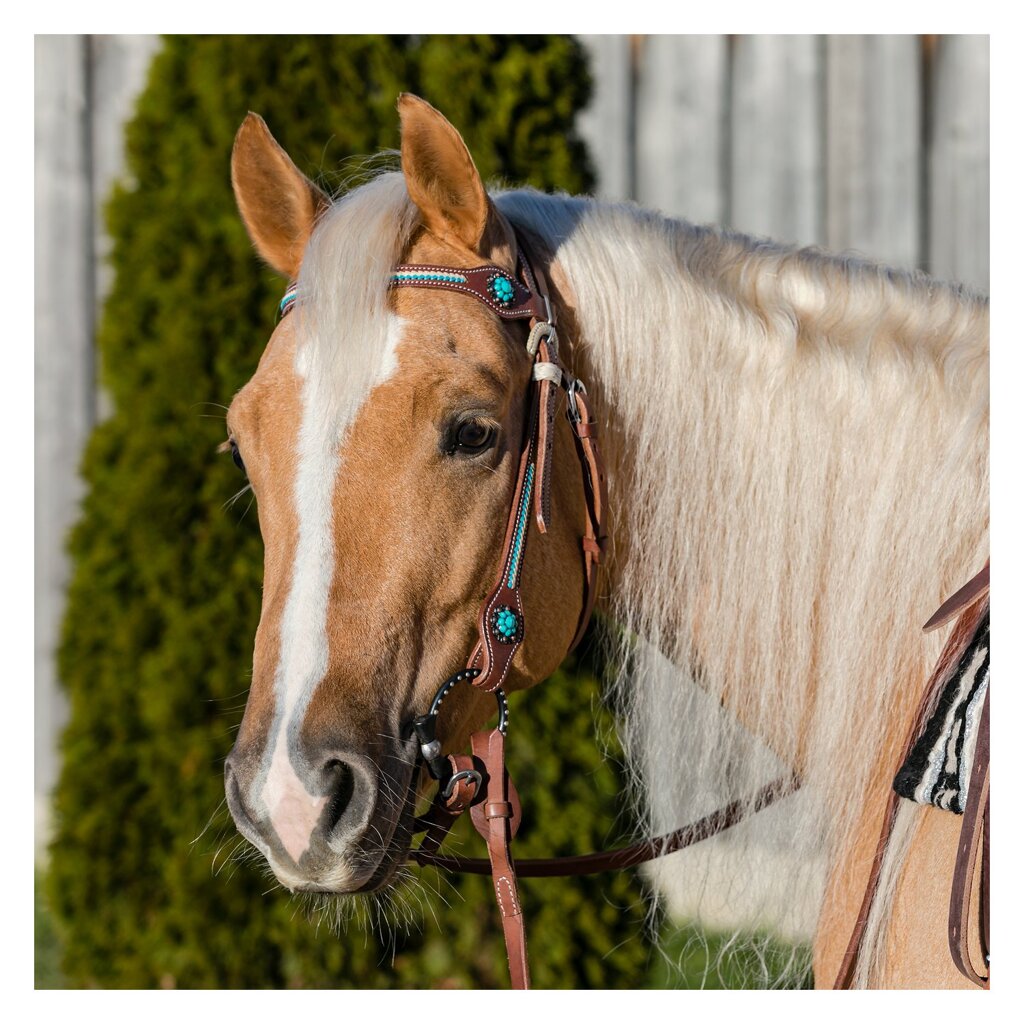 Westernowa uzda Nashville od L-pro West jest wykonana z argentyńskiej skóry bydlęcej. Uzda jest ozdobiona kontrastowymi szwami, plecionką z rawhide oraz turkusowymi conchami. Uzda ma klasyczny naczółek, mocowanie wędzidła na śrubowy system Chicago.Pasujący naczółek przyciąga wzrok. Ze srebrnym okuciem i śrubowym systemem Chicago. Elegancka uzda Nashville jest dostarczana bez wędzidła, wodzy i paska podbródkowego.