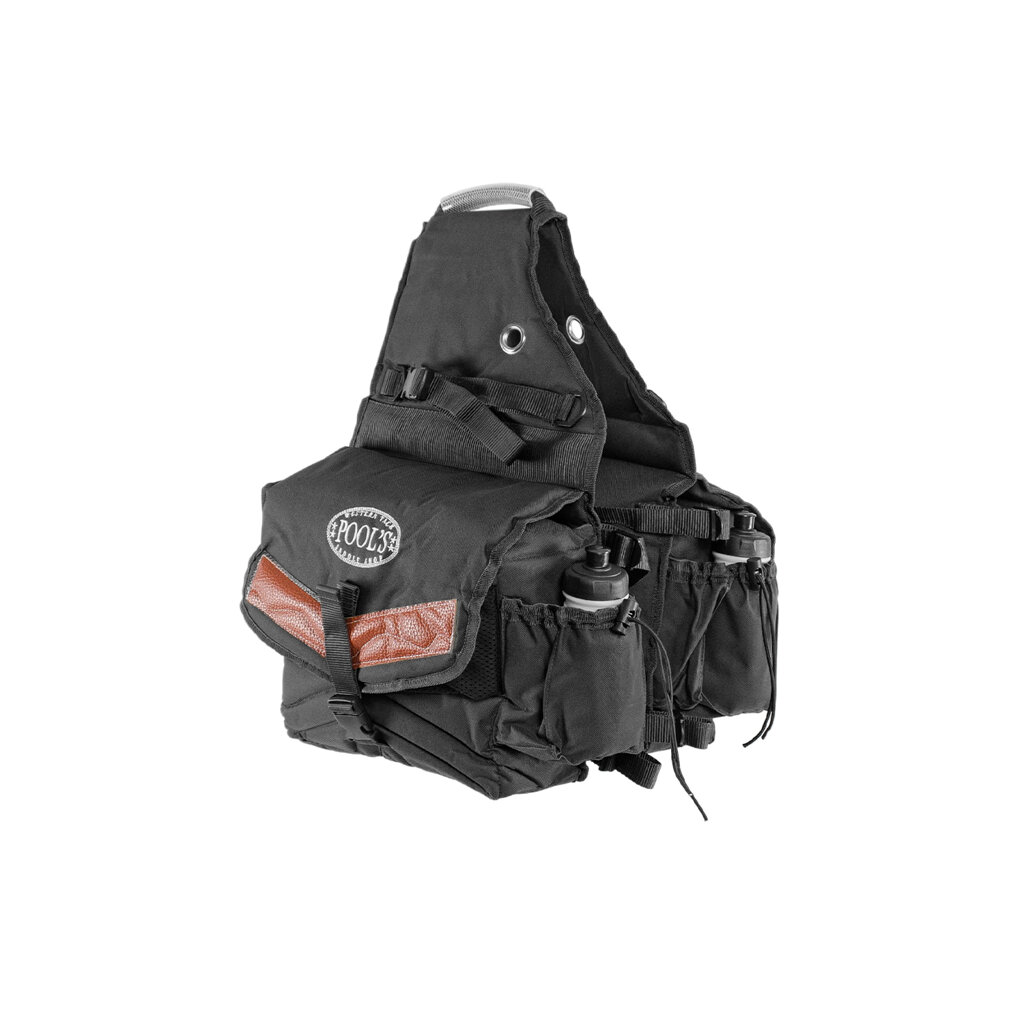 Wysokiej jakości dwuczęściowe sakwy do siodła westernowego wykonane z bardzo wytrzymałego i odpornego materiału nylonowego. Po obu stronach sakw znajduje się kieszeń z plastikową butelką o pojemności ok. 0,5 l. W jednej z kieszeni wewnątrz, na ściance, naszyty jest siatkowy materiał tworzący dodatkową przegrodę, w drugiej kieszeni znajdują się 2 przegrody z tego samego materiału, co sakwy. Z boku jednej kieszeni naszyta jest kieszonka na telefon komórkowy zapinana na rzep. Wejście do obu sakw jest chronione klapą przed wypadnięciem zawartości.• dwuczęściowa sakwa