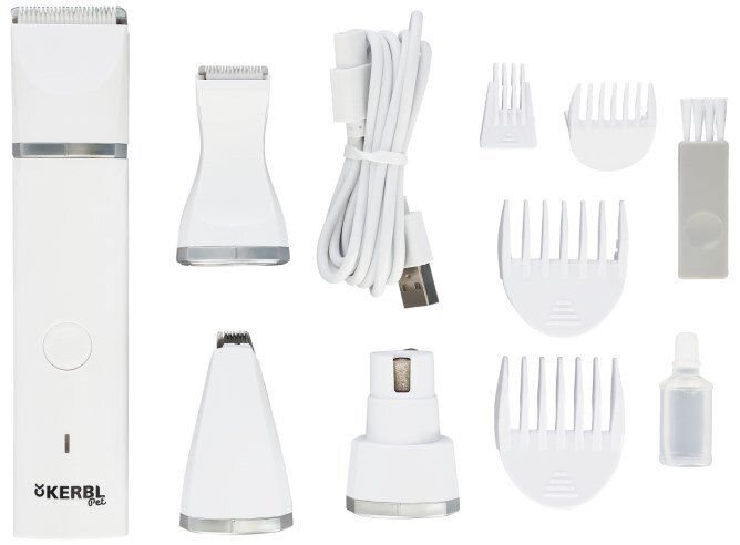 - w tym głowica tnąca do dużych powierzchni, głowica tnąca do strzyżenia detali, głowica tnąca do małego strzyżenia i kamień ostrzący do pielęgnacji pazurów