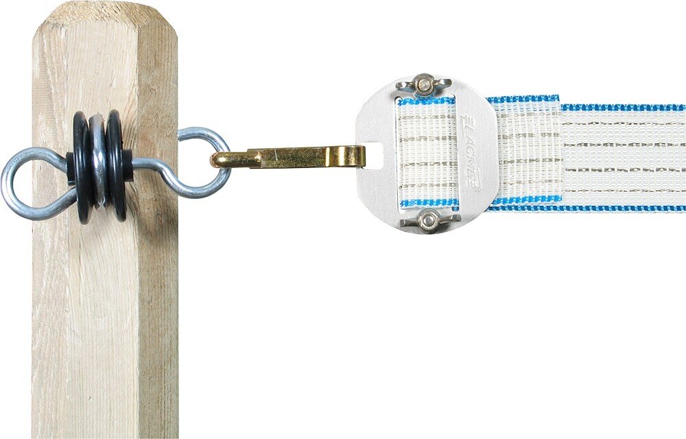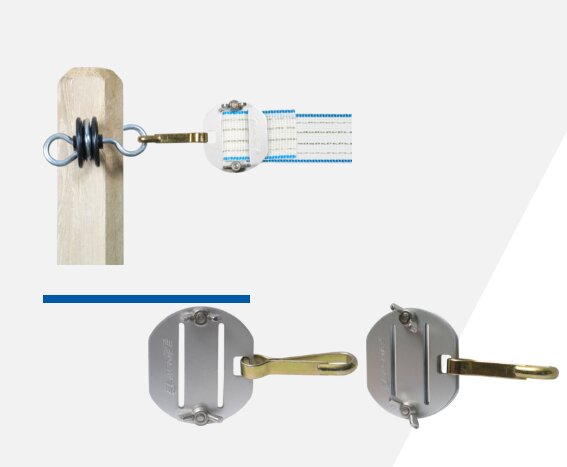 Praktyczny łącznik przeznaczony do taśm ogrodzeniowych o szerokości do 40 mm, umożliwiający szybkie i bezpieczne łączenie taśmy w ogrodzeniu elektrycznym. Dzięki zintegrowanemu karabińczykowi ze stali nierdzewnej taśmę można łatwo łączyć i rozłączać, np. przy furtkach, przejściach lub tymczasowych wejściach do ogrodzenia.