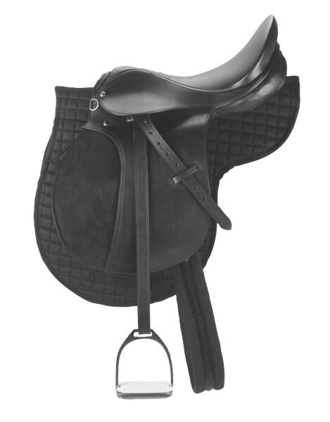Kompletny zestaw odpowiedni dla szkółek jeździeckich. Zestaw zawiera siodło wykonane ze skóry gładkiej z elementami zamszowymi na tybinkach, bawełniany czaprak z klasycznym pikowaniem, bawełniany popręg, skórzane puśliska oraz klasyczne strzemiona.• Rozmiar: Pony